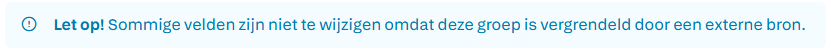 - Zie je de melding: Let op! Sommige velden zijn niet te wijzigen omdat deze groep is vergrendeld door een externe bron, dan is de groep geïmporteerd uit een externe bron, meestal het leerlingadministratiesysteem (LAS). Je zal de wijziging in de externe bron moeten uitvoeren. De volgende dag zal de wijziging in Admin zichtbaar zijn.