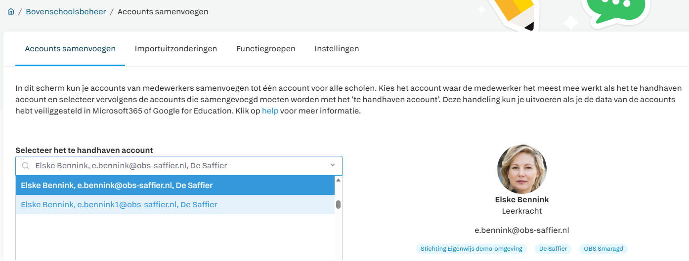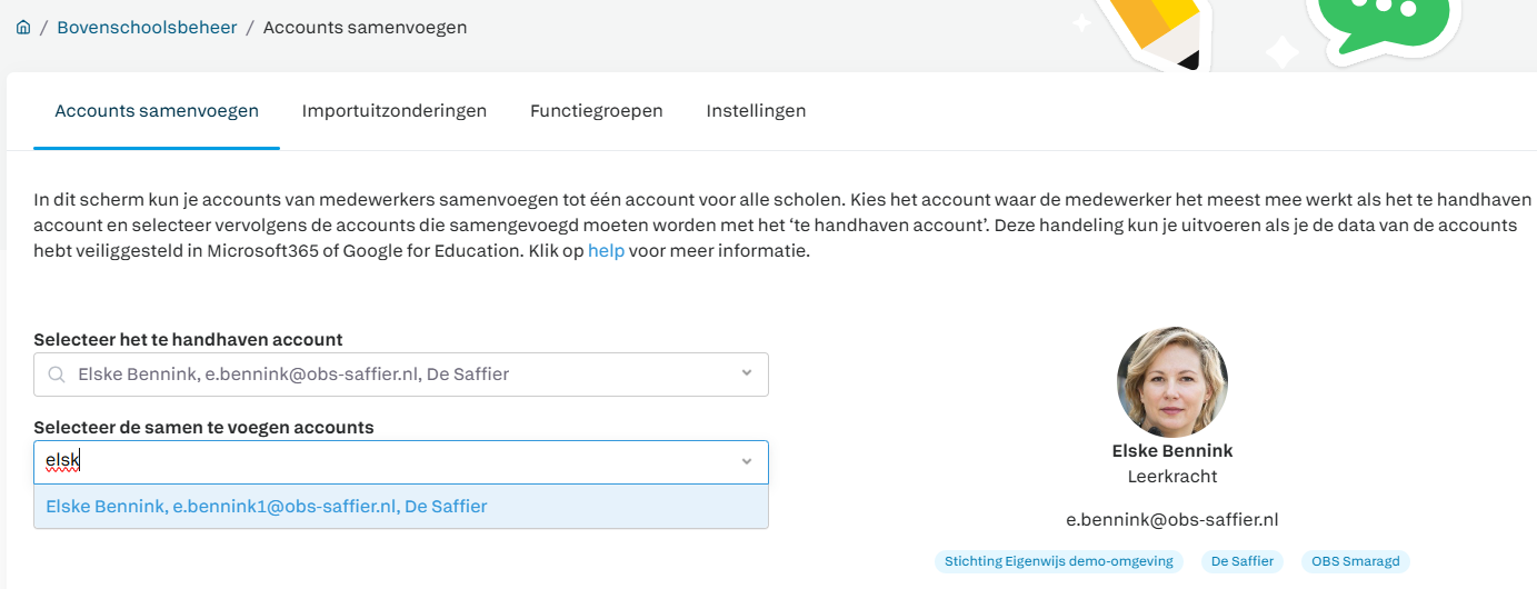 Het samenvoegen van accounts kan alleen worden uitgevoerd door de bovenschools ICT-coördinator.
